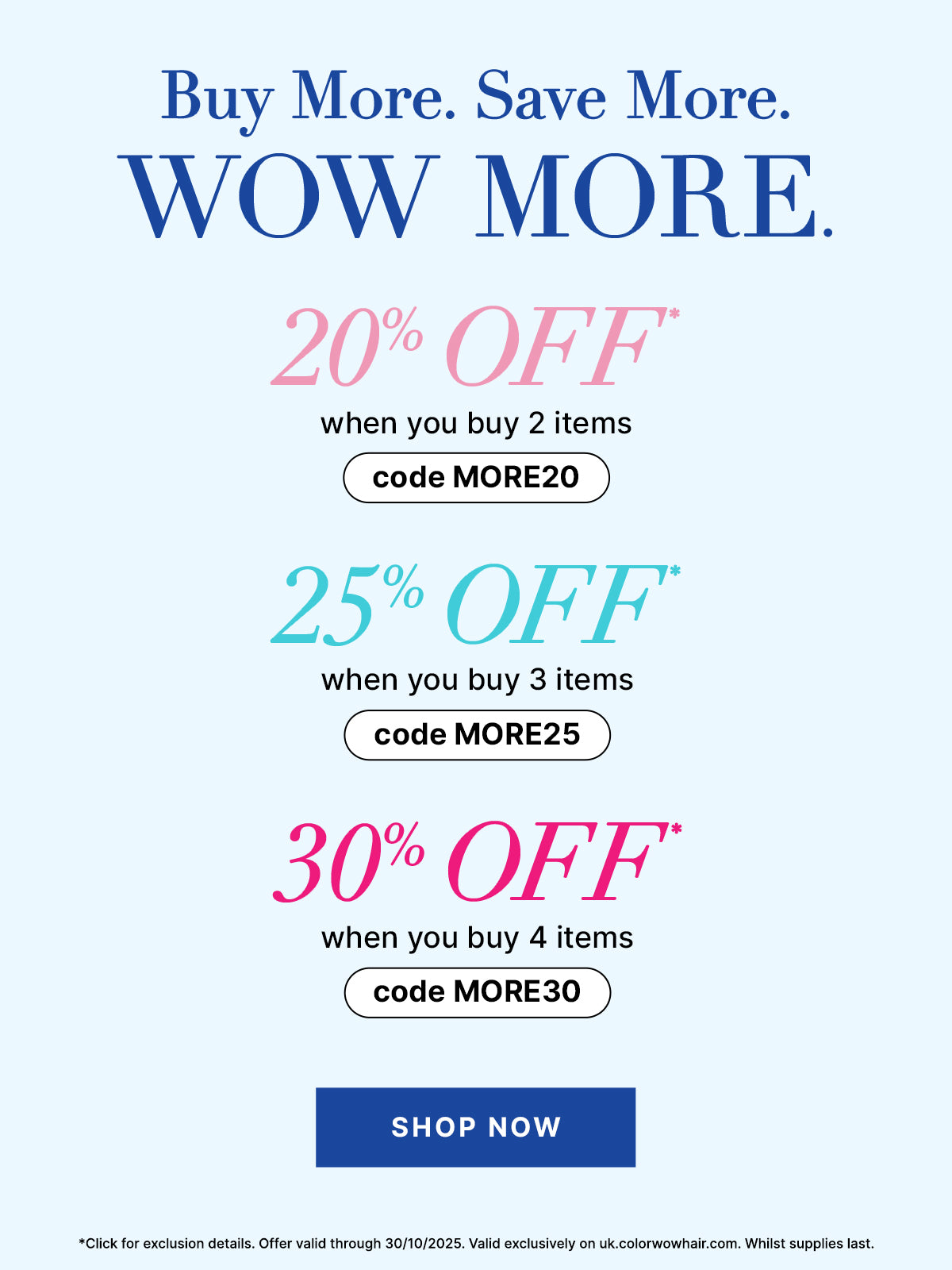 *Does not apply to orders before 28/10/25. 20% OFF when you buy 2 items, 25% OFF when you buy 3 items, and 30% OFF when buy 4 items, offer valid through 30/10/25. Promotional codes cannot be combined with other offers and are not valid on subscriptions under the Color Wow Subscription Program. Excludes travel sizes. Valid exclusively for select non-sale items on uk.colorwowhair.com. Whilst supplies last.
