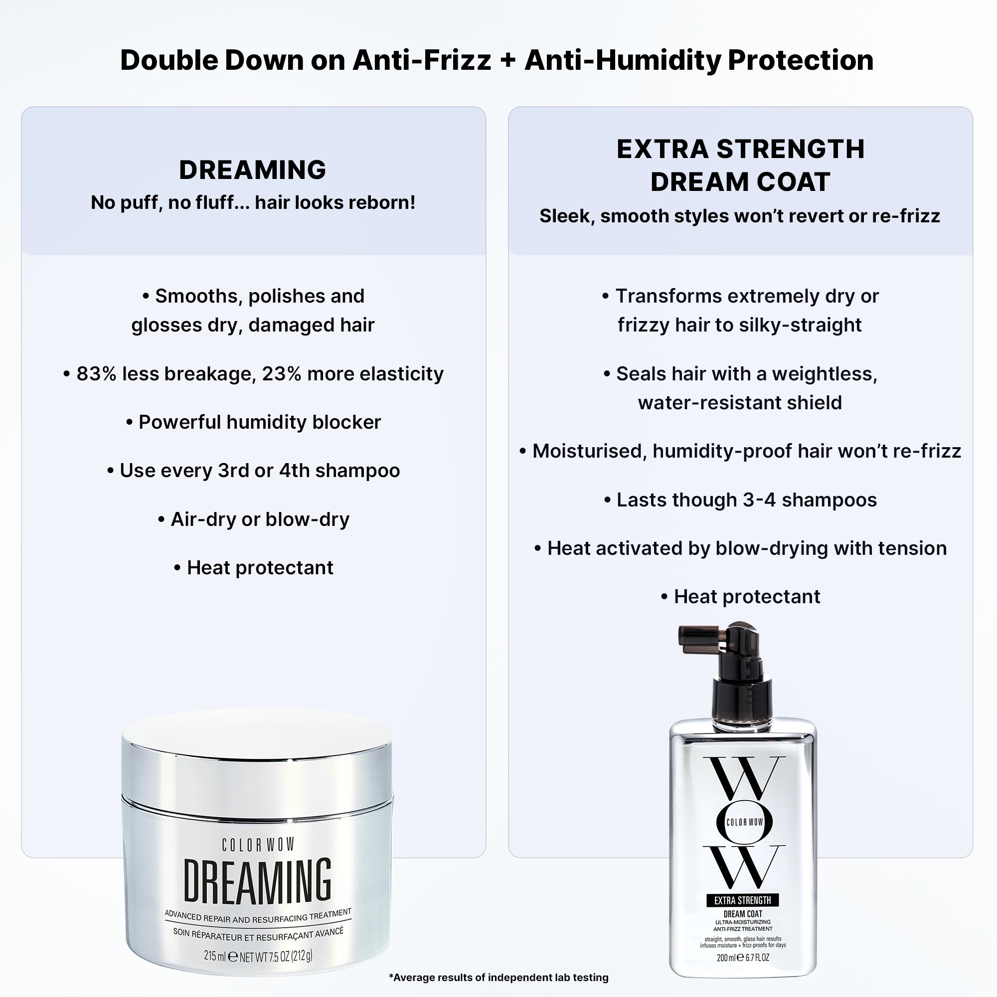 Use Dreaming 1–2 times a week as a deep treatment. Use Extra Strength Dream Coat every 3–4 shampoos (or weekly) and blow-dry using tension to activate the formula and achieve sleek, straight, humidity-proof results.